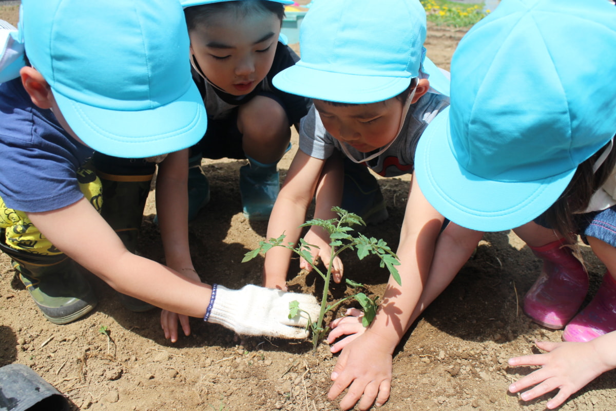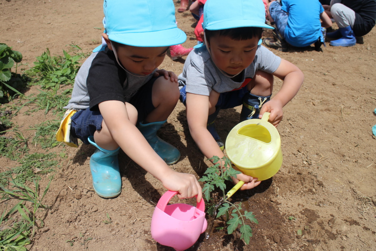 アクセスじゃがいも、トマト、きゅうり、とうもろこしなどの野菜を植えました。「実ったらどうやって食べる?」と聞くと、「カレー!」「漬け物!」「そのまま!!」とたくさん出てきました。これからは、朝登園してからや活動の中で、水やりや草むしりをして秋までお世話していきます。