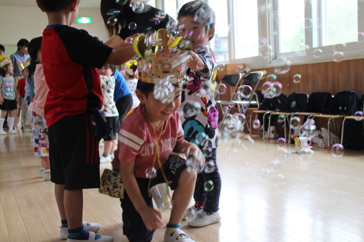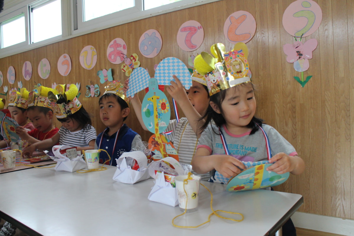 今日は、4・5・6月生まれの誕生会でした。今回はきく組が司会進行、ふじ組が出し物、ゆり組がプレゼントを作りました。♪たんたんたんたん たんじょうび♪ と、歌とみんなの手拍子で入場し、うれしさいっぱいの誕生者でした。