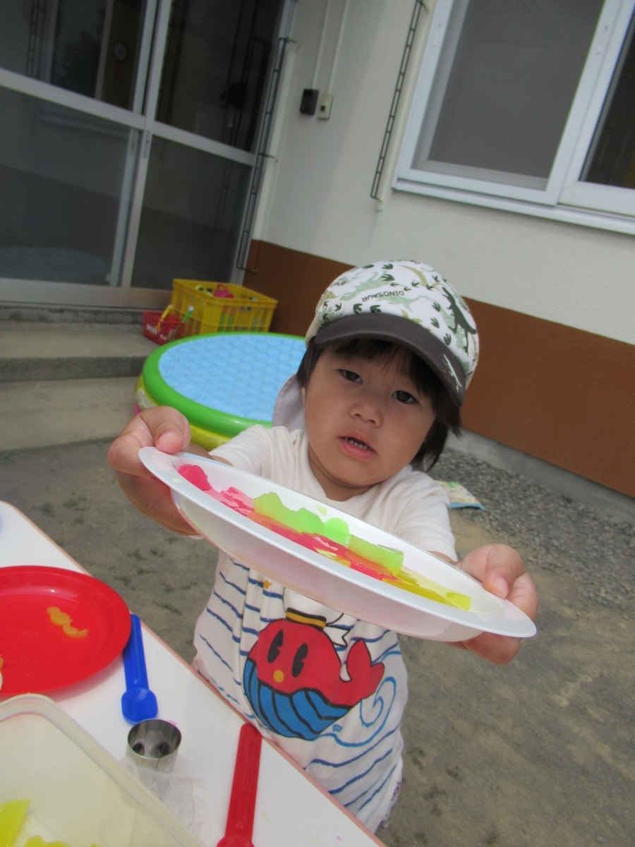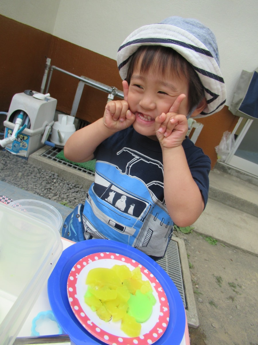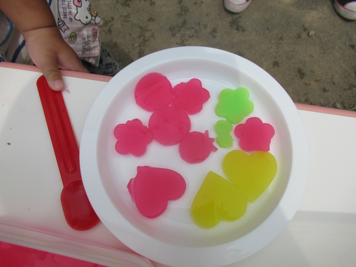 ひまわり組は参観日で“ゼリー屋さん”をしました。寒天ゼリーの感触はひんやり、つるつる!みんなで型抜きをして楽しみました!