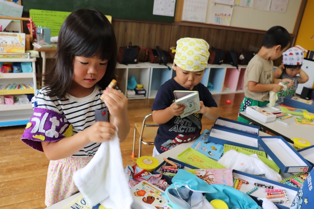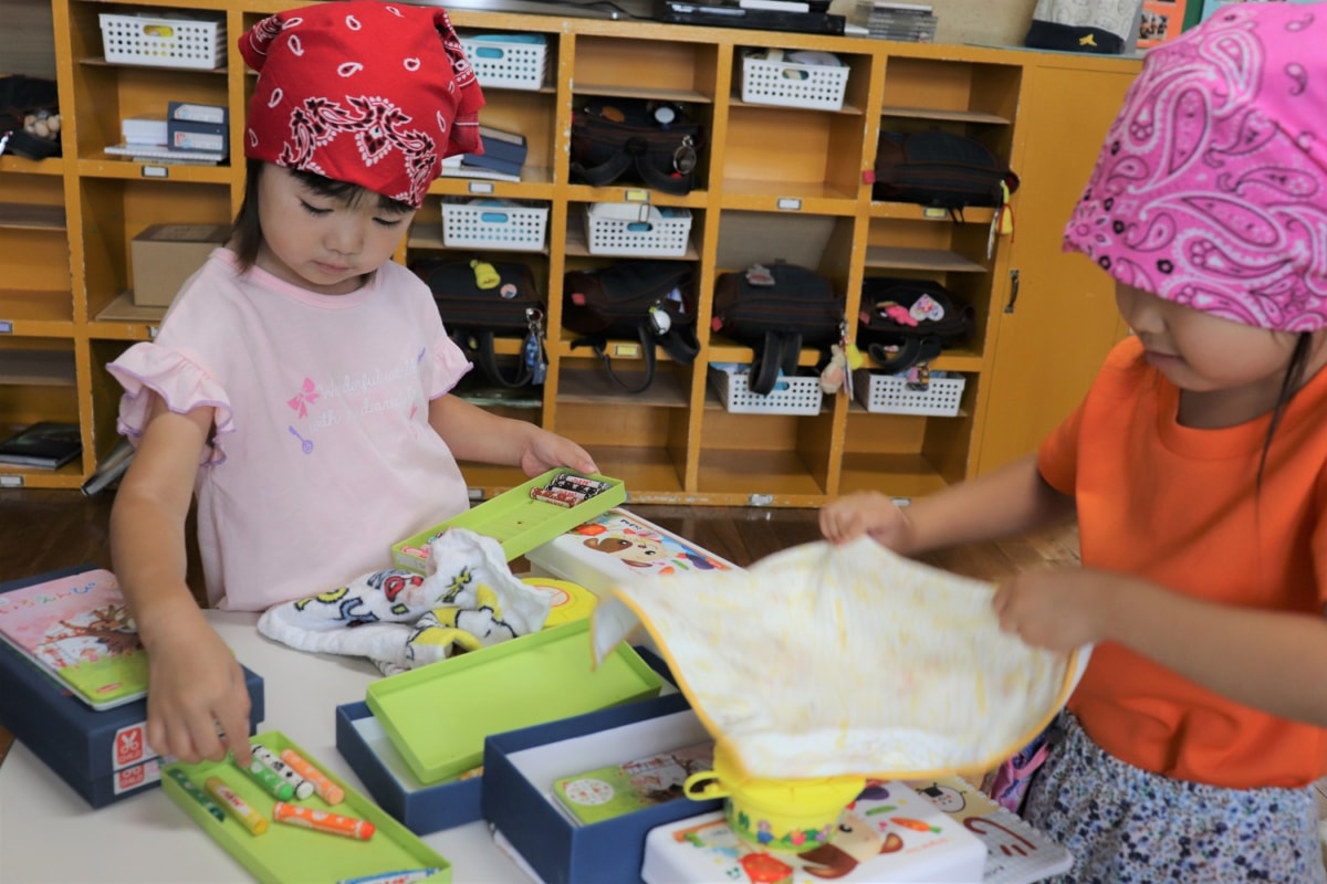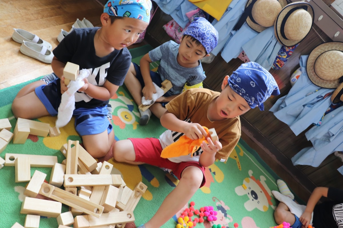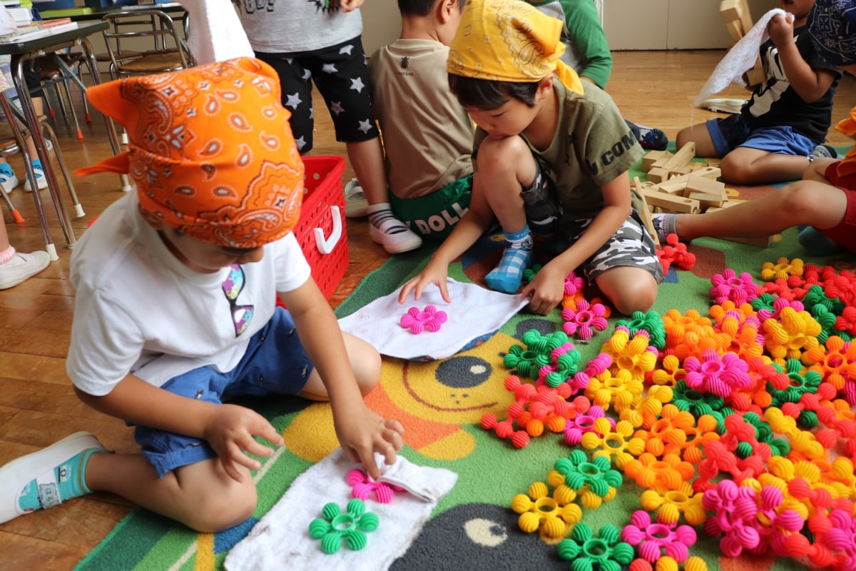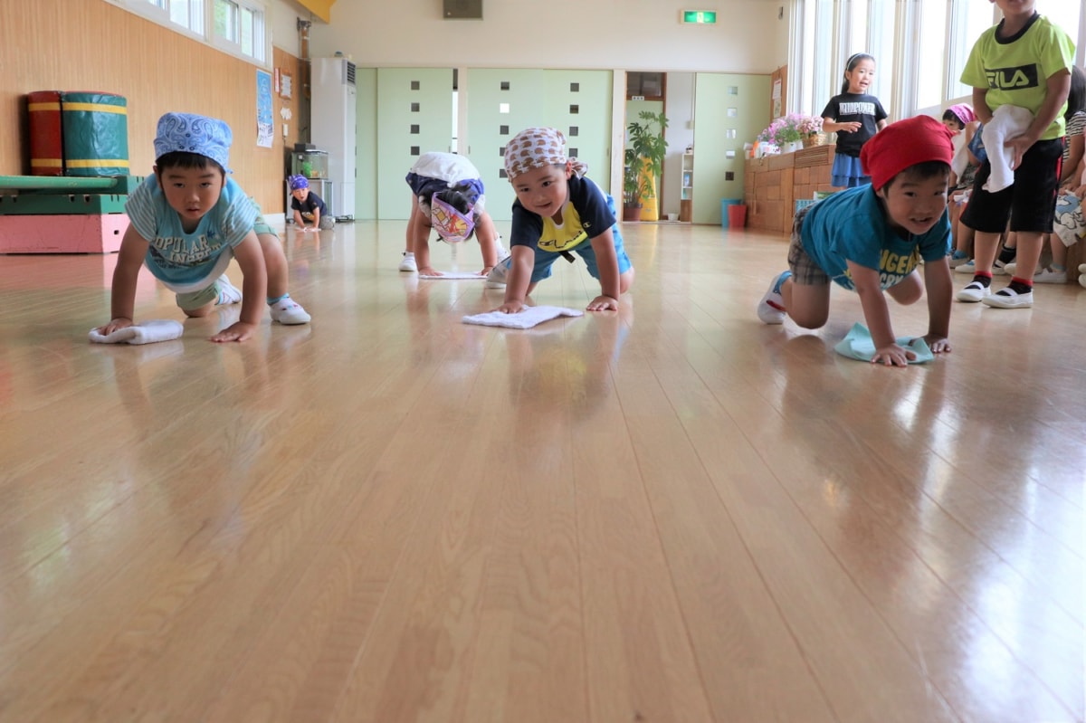 明日で1学期も終わり夏休みに入ります。今日は大掃除。自分のロッカーや玩具をきれいにしました。おあそび室はみんなで1列になって床拭きをしました。