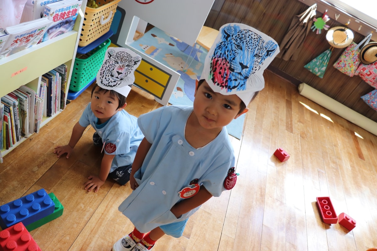 9月13日に全クラスでお面づくりをして、17日にはお面を使って“なりきりあそび”や“動物園ごっこ”をしました。