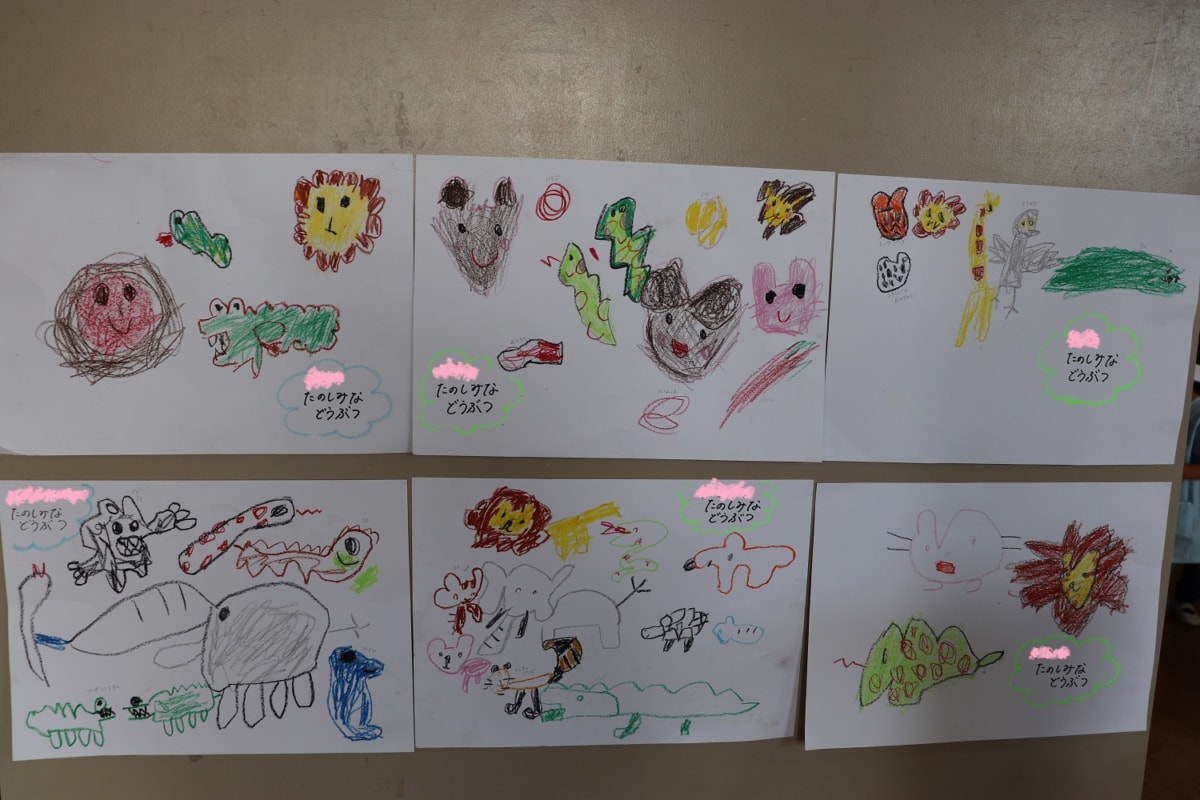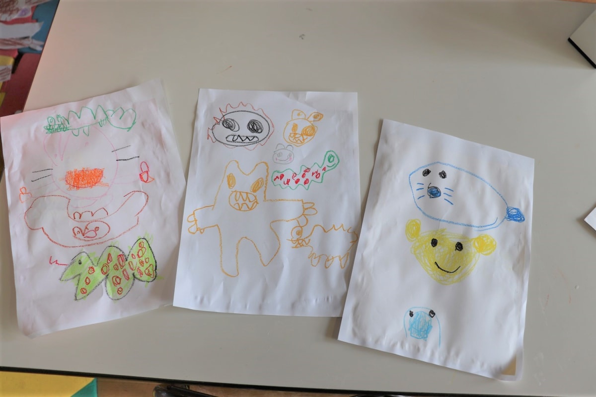 今日は動物園に向けてごみ袋づくり。ごみをきちんと捨てる大切さを知り、好きな絵を描いてお気に入りの袋をつくりました。