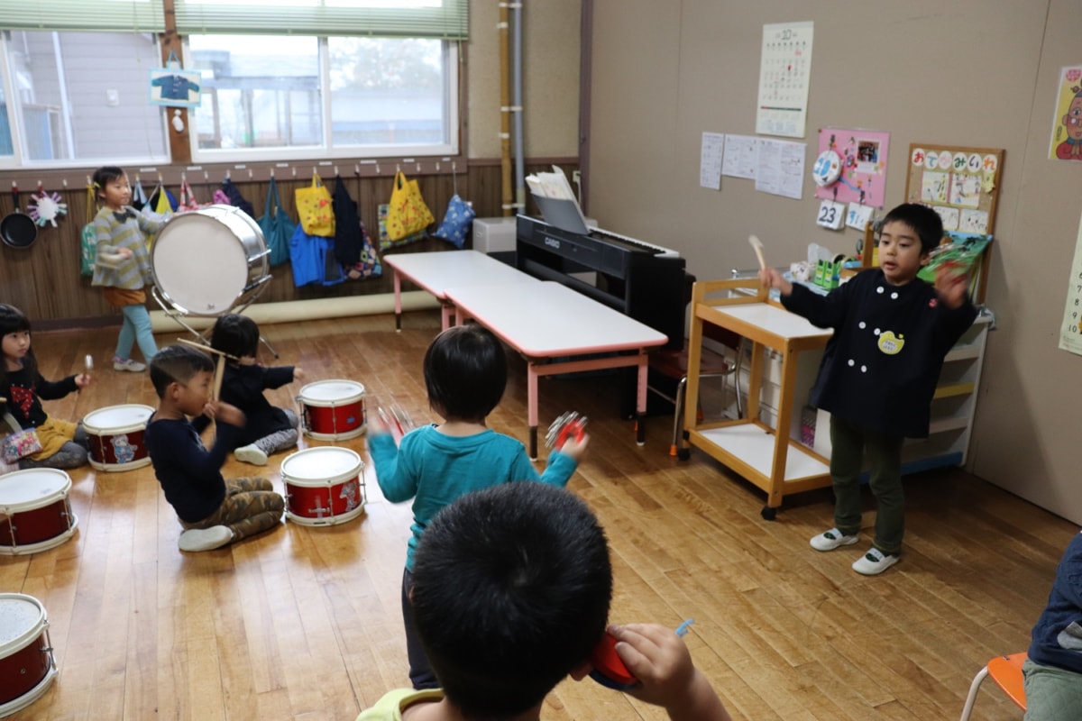 “芸術の秋” 今日の預かり保育は楽器あそびを楽しみました。太鼓は年長組が長い間練習していたのを見ていたので、小さい組には憧れの楽器!喜んで触れていました。