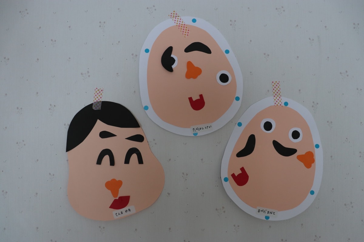 今日の預かり保育のあそびは、福笑い。1人ひとり挑戦したら、必ず大笑い!!できた顔は玄関に飾りました。