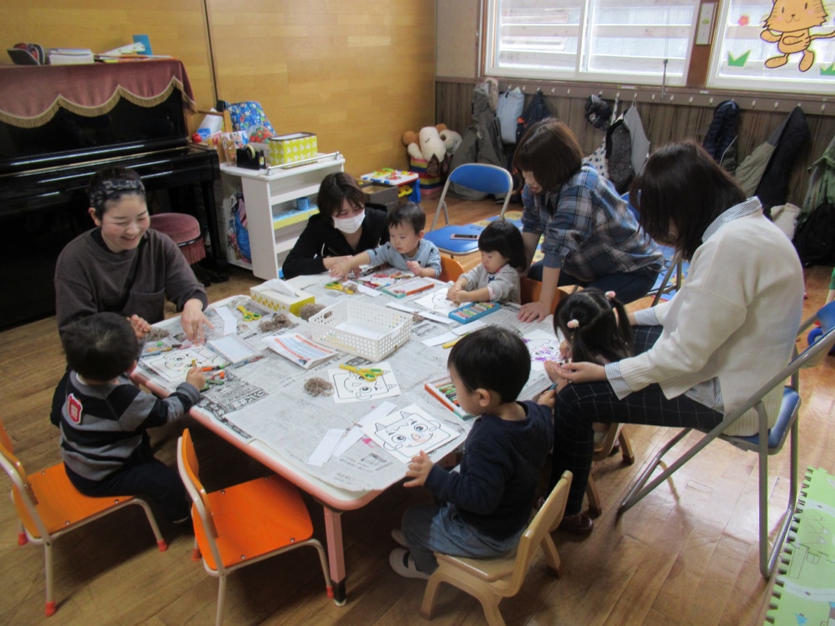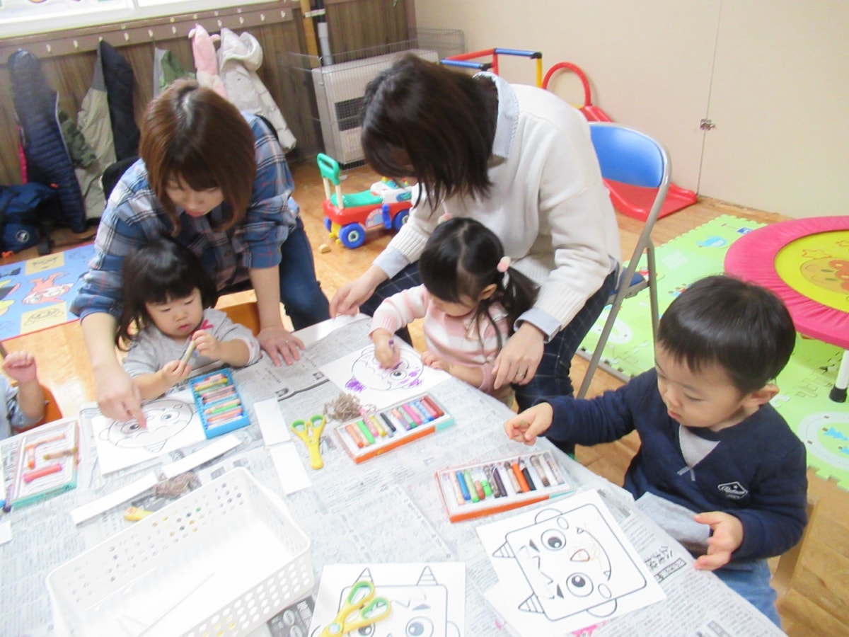 今日は2歳児教室ひまわり組の開放でした。みんなでおやつを食べたり、オニのお面を作って楽しみました。