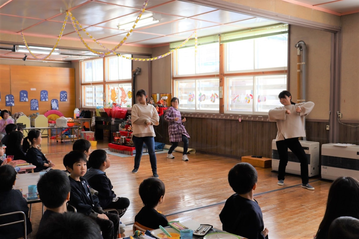子どもたちが大喜びの先生達の出し物。“やる気マッチョマン”のゆうぎ、かっこいい?!