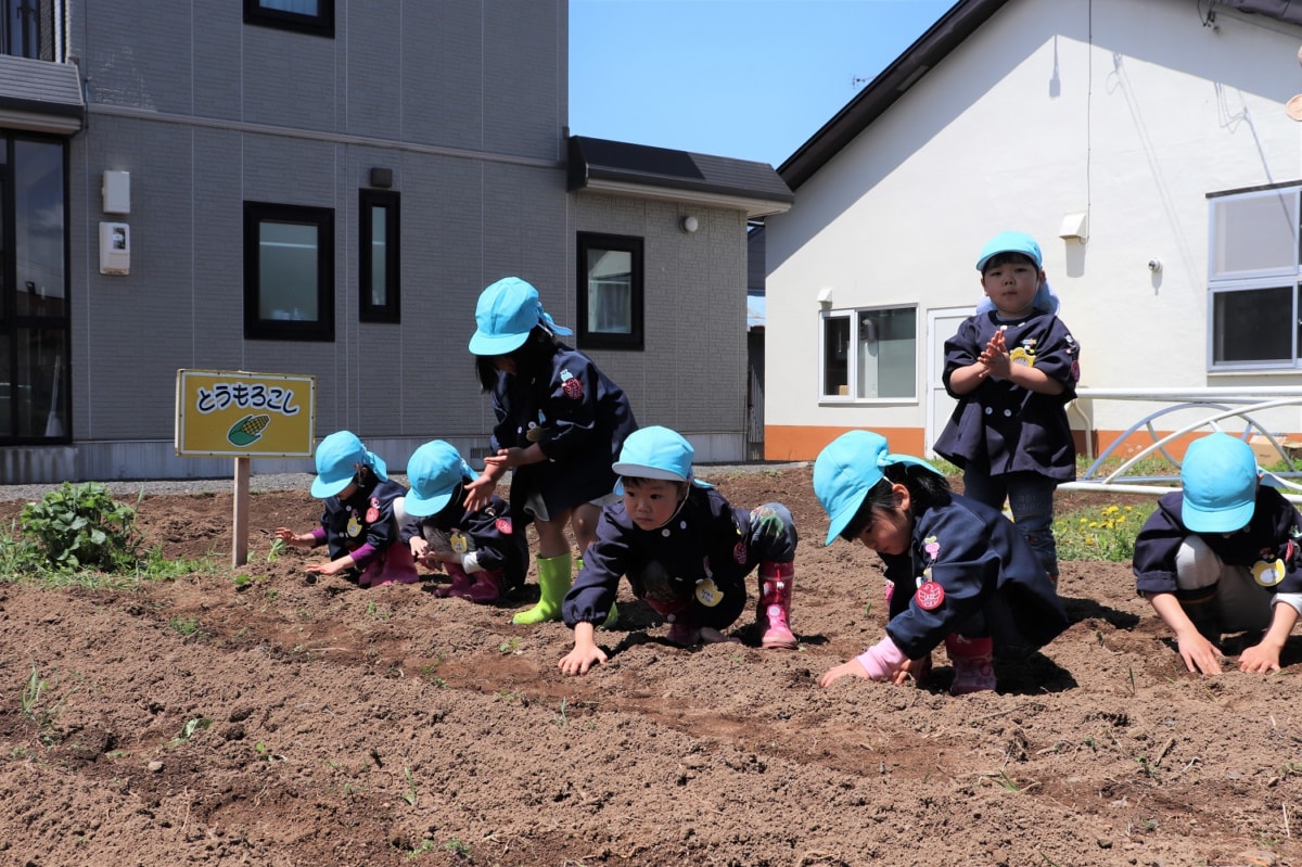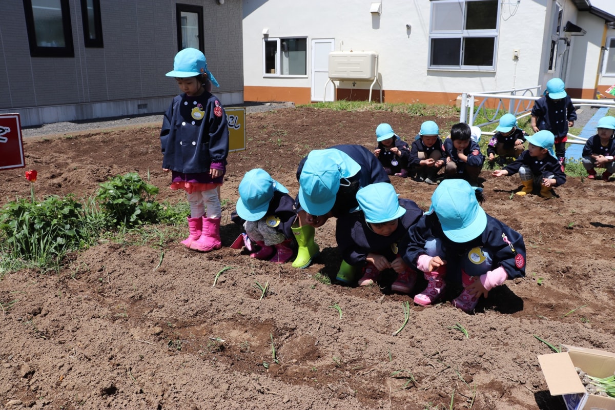 一列に並んでじゃがいもを植えました。「じゃがいもは何で種じゃないの?」と言っていた子もいました。