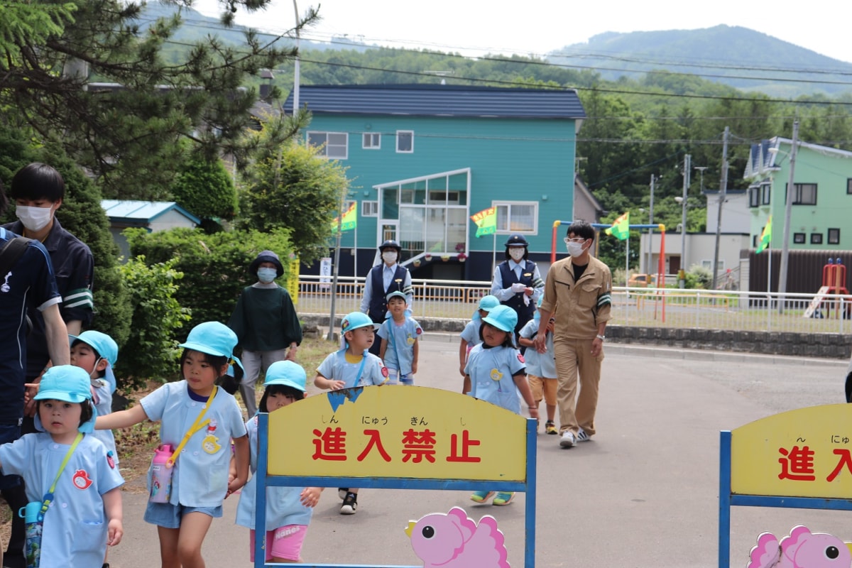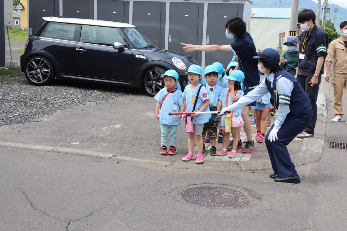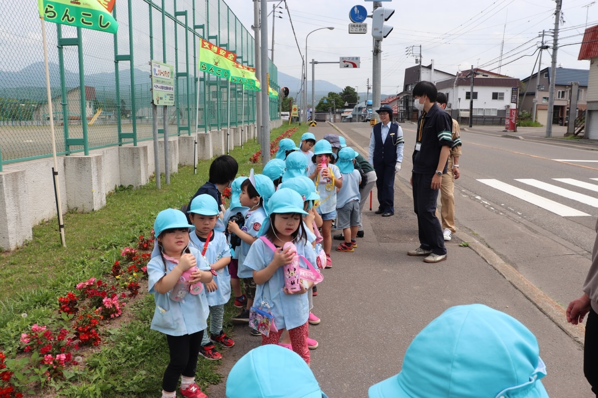 天候不順で延期となった「こぐまクラブ」。保護者の参加は見合わせ子ども達で行いました。交通安全の紙芝居を見て、道路の横断の仕方、信号機のある横断歩道の渡り方も勉強しましたよ。蘭越町の交通安全運動推進委員会の指導員の方など5名の方の指導のもと、道路を実際に歩いて確認をしました。