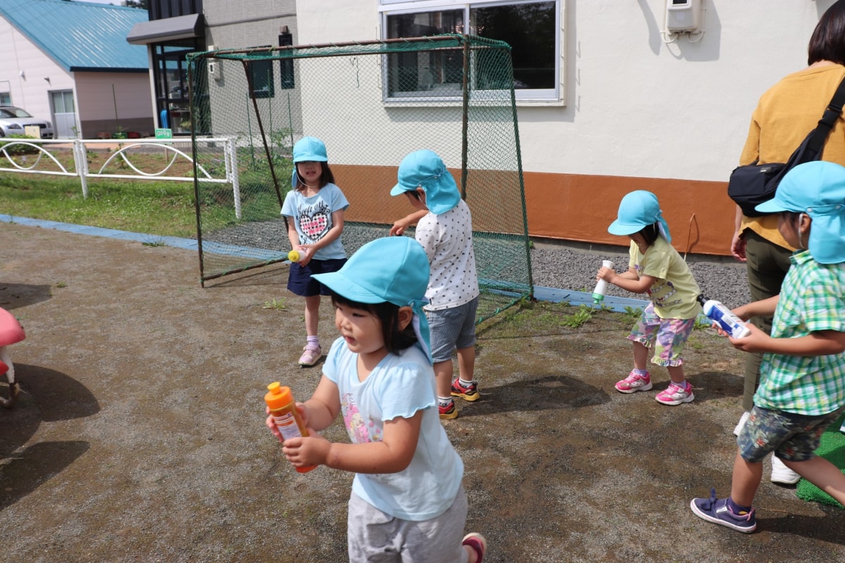 みんなが楽しみにしていた水遊び!全員で集まって水遊びのお約束を聞いた後、さっそく水を飛ばして楽しみました。初めてのお友だちは“アクアプレイ”に夢中でした。