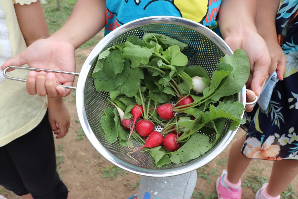 アクセス6月22日に年長きく組が種を蒔いたラディッシュ。少し気温が高くなってきたので、ぐんぐん大きくなり、今日7月17日にひとりずつ収穫。