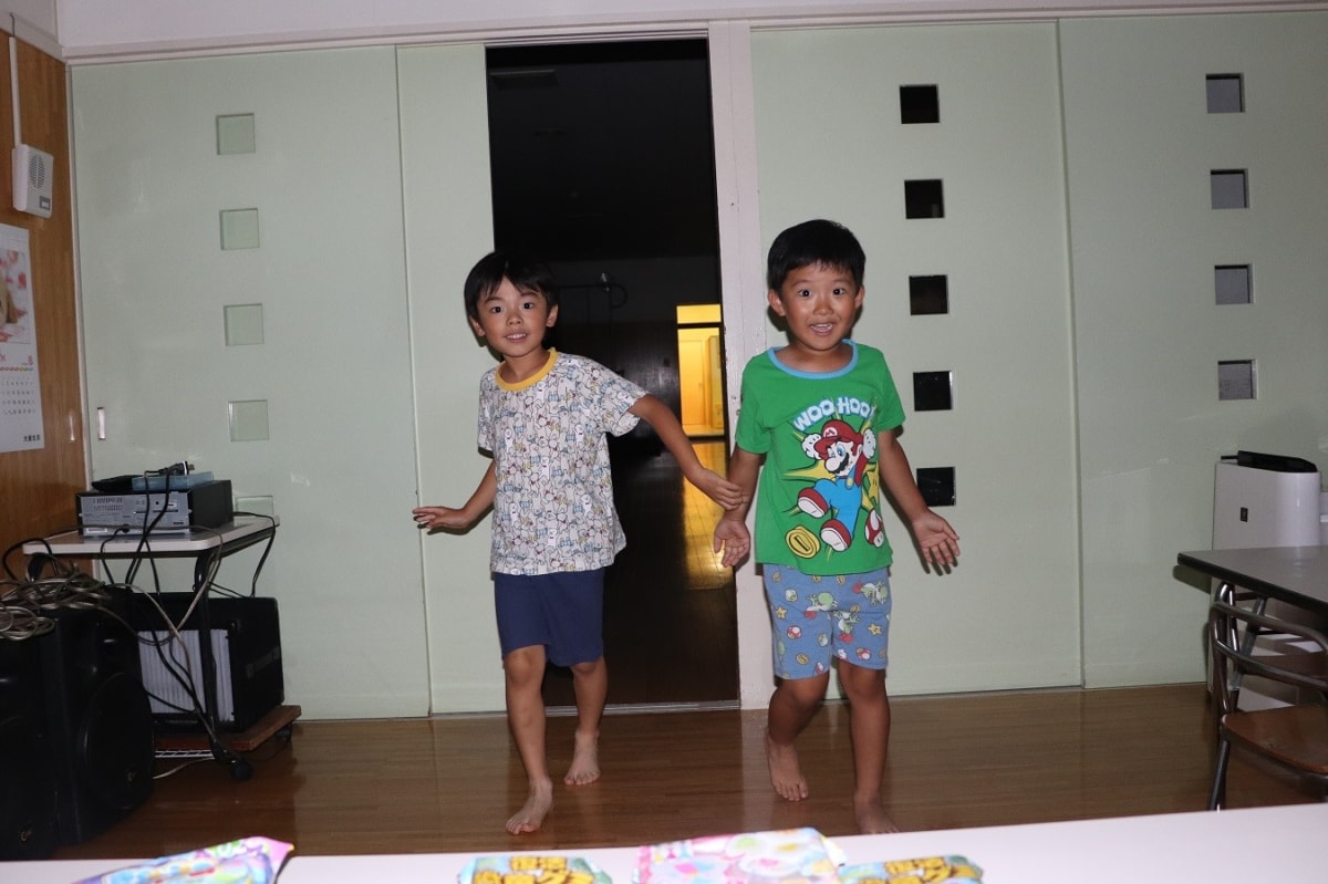 翌朝は、ラジオ体操をして太鼓の演奏をして、みんなでさようなら。2名欠席で寂しさもありましたが、楽しかったね。