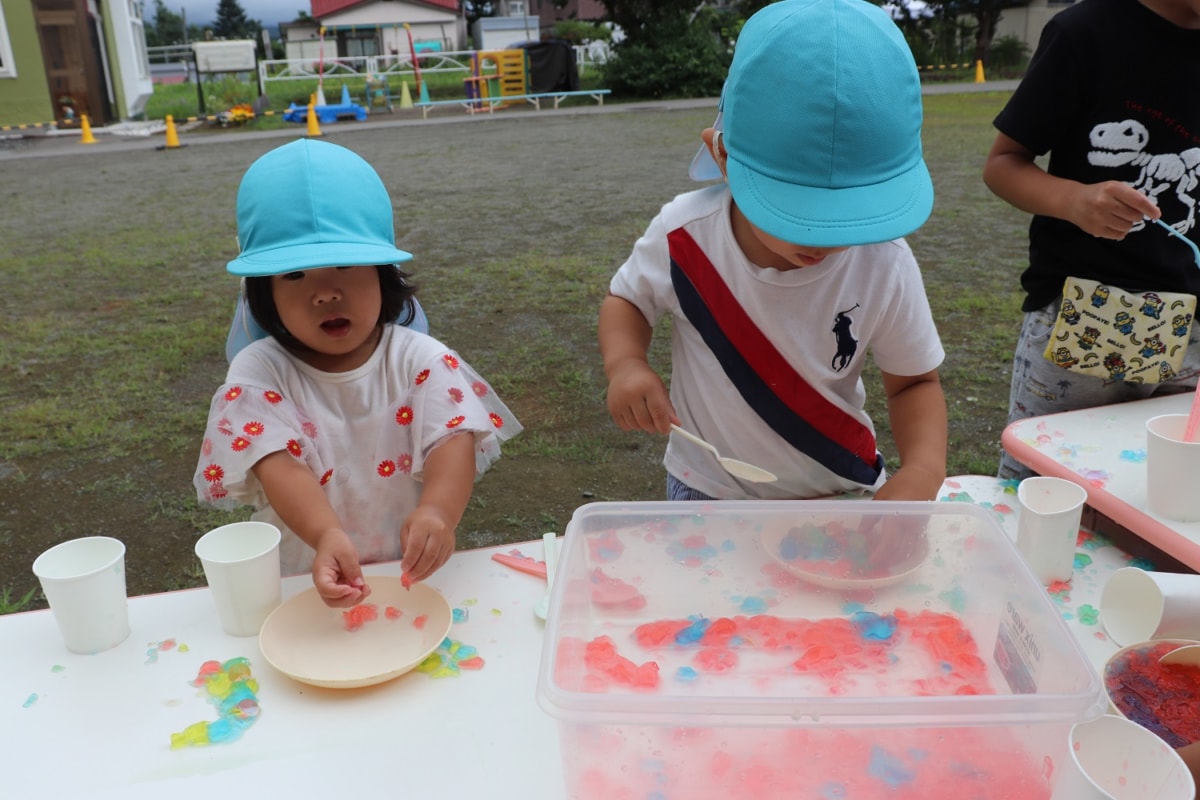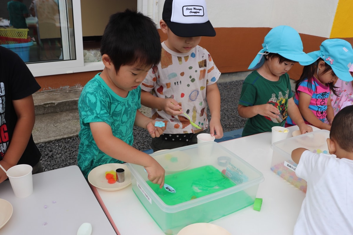 アクセス今は夏休み預かり保育で遊んでいる子ども達です。今日は、先生が用意した遊び用のゼラチンと絵の具で作ったゼリーで「ゼリー屋さんごっこ」をしました。