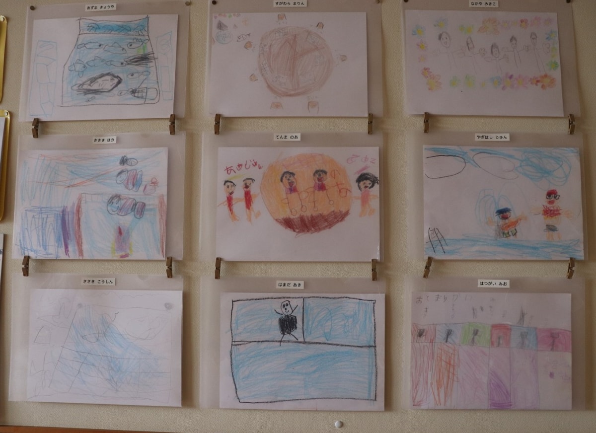 きく組は楽しかった夏休みの思い出として、おとまり会や水族館、プールの絵もありましたよ。