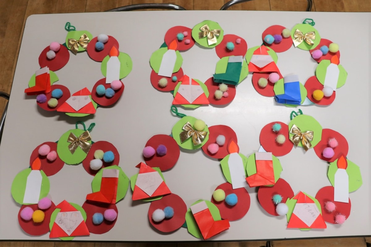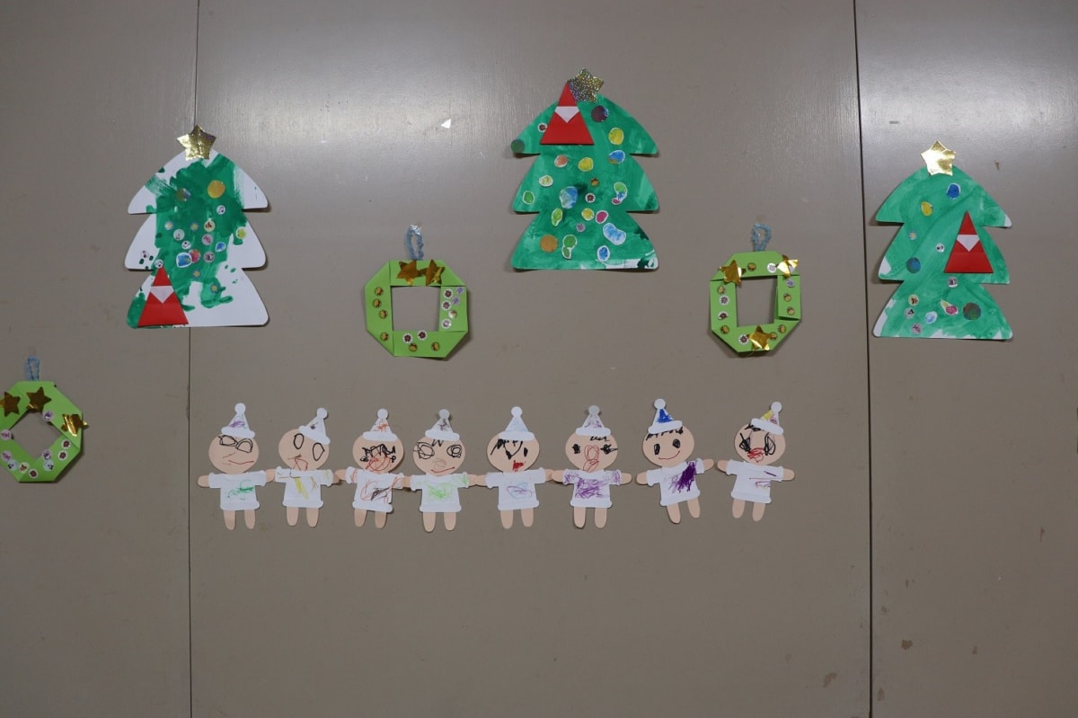 ひまわり組も作ったよ。帽子をかぶって手をつないだ仲良しさんと一緒に、ツリーとリース。