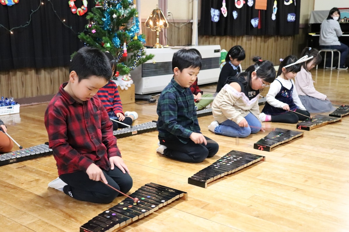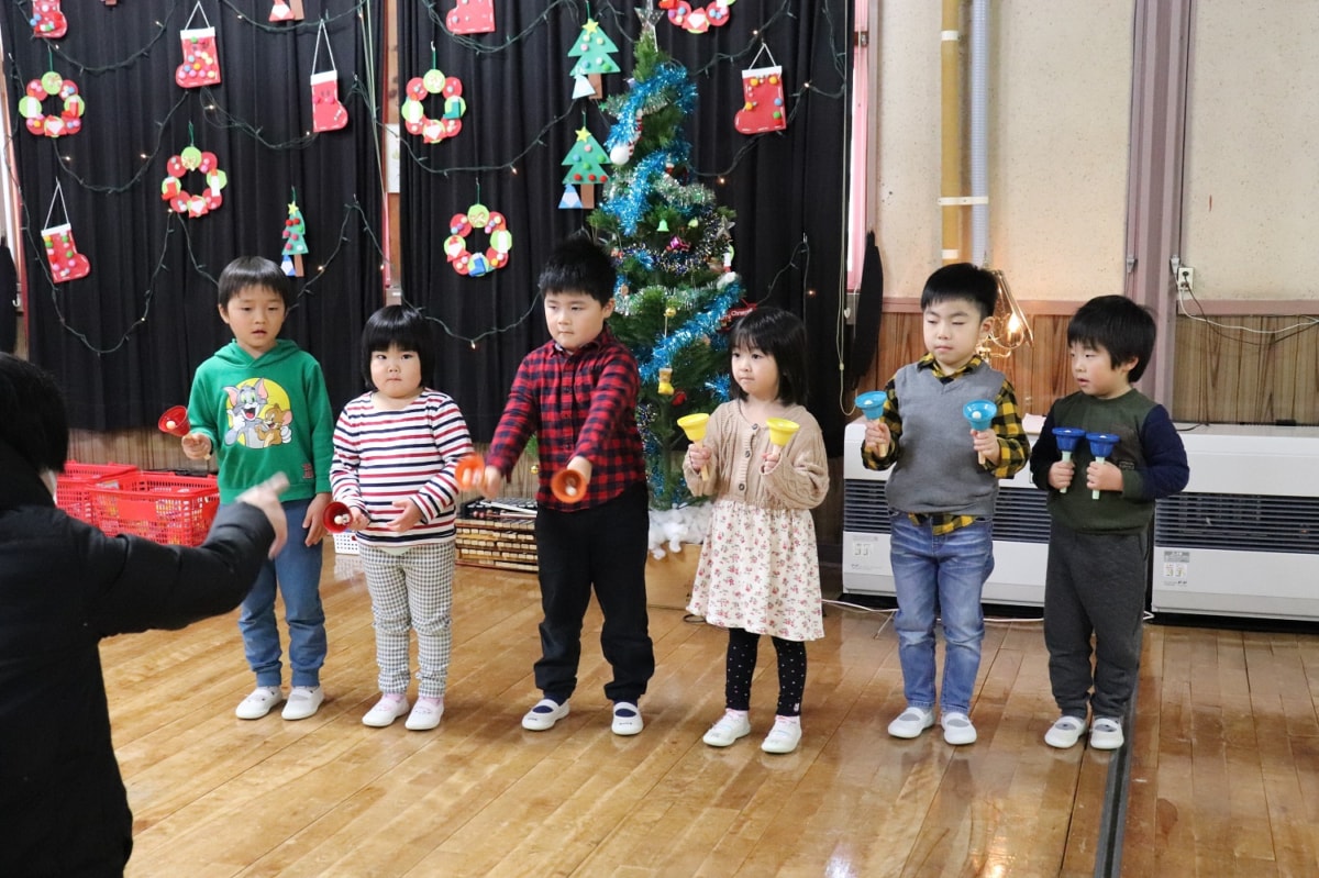木琴、鉄琴、ハンドベルを披露。歌は赤鼻のトナカイとあわてんぼうのサンタクロース♪