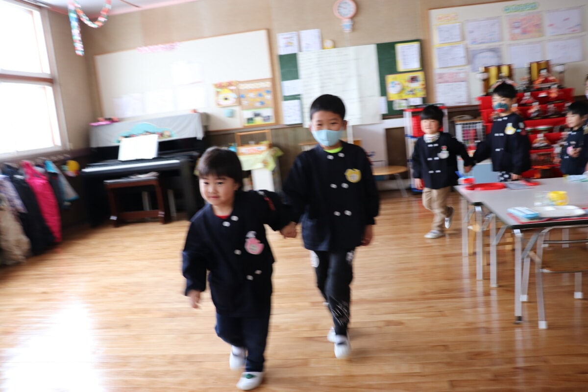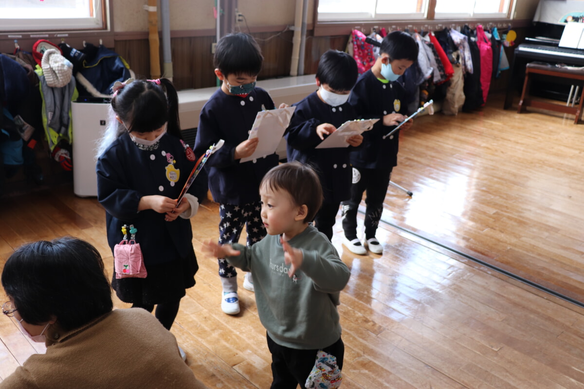 2月26日、いよいよ楽しみにしていたおわかれ会!ゆり組、ふじ組と手をつないで、ちょっぴりはにかみながら“1年生になったら”の曲で入場しました。