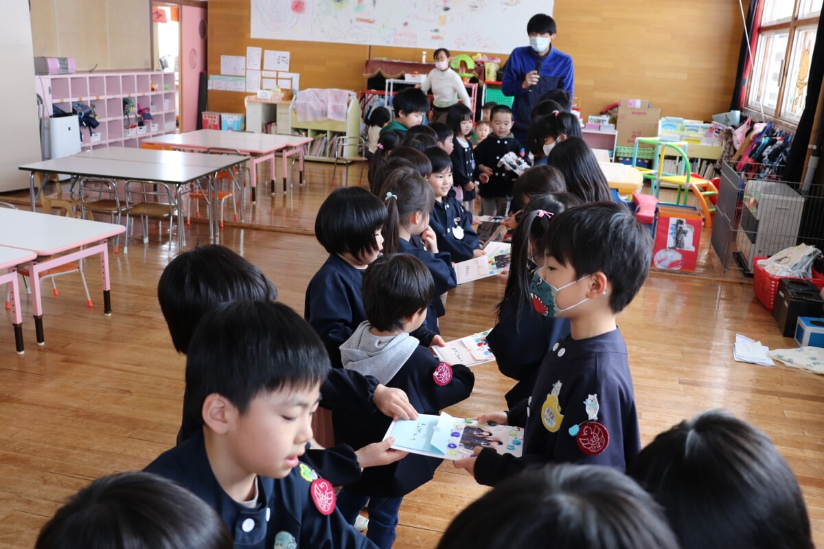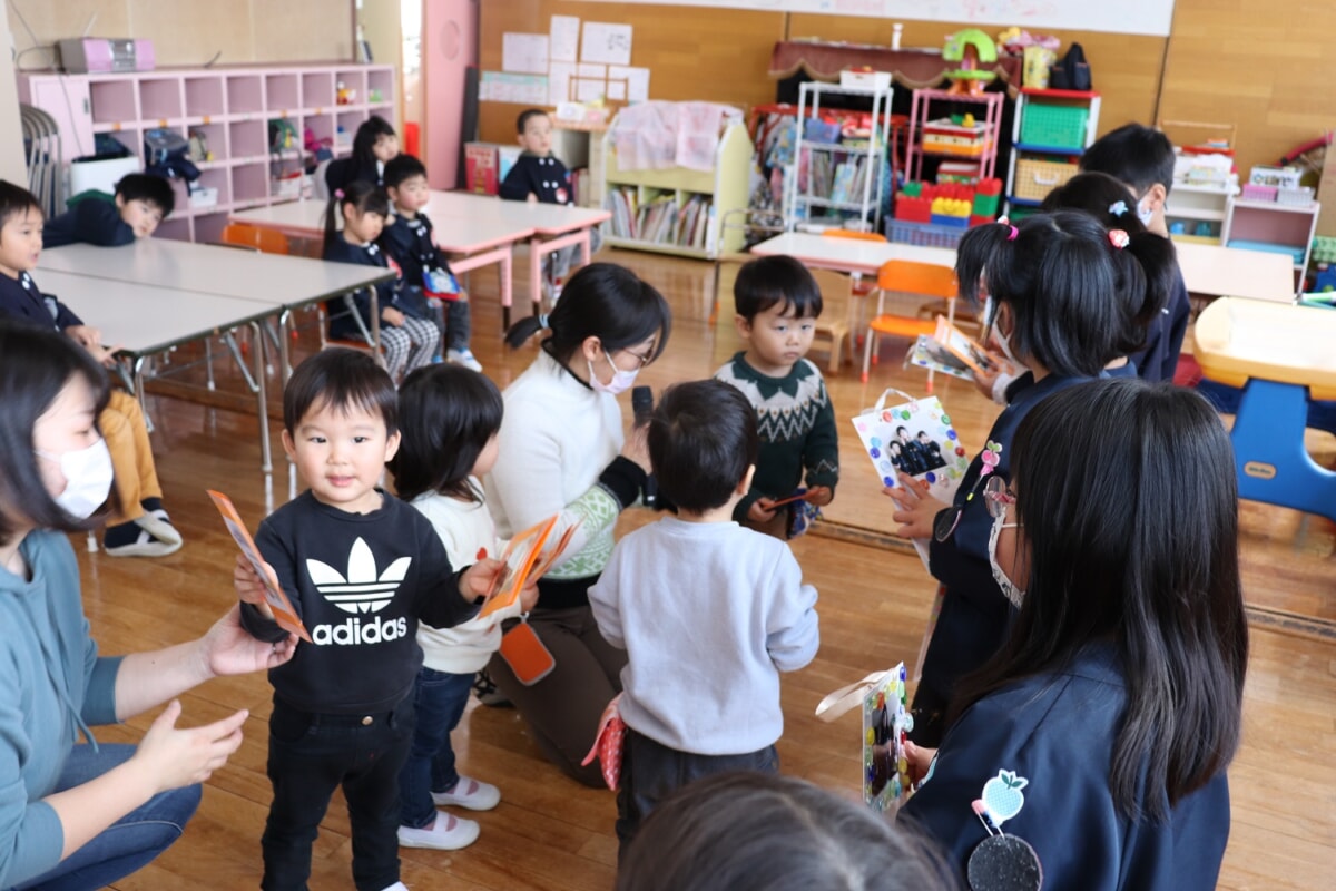 おわかれ会の案内状を作ったもも、ゆり、ふじ組。2月19日にきく組へ「おわかれかいに きてください」と渡しました。
