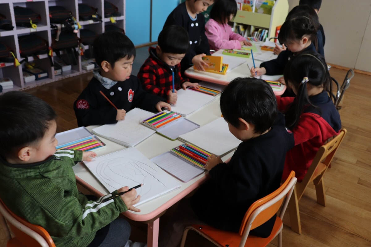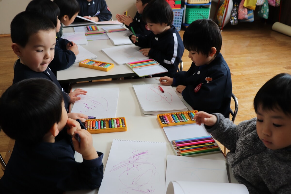 今日は自由画帳に絵を描きました。クレヨンや色えんぴつで何を描こうか構図を考え中…。