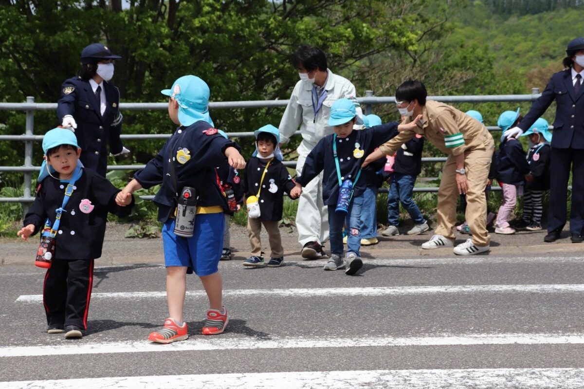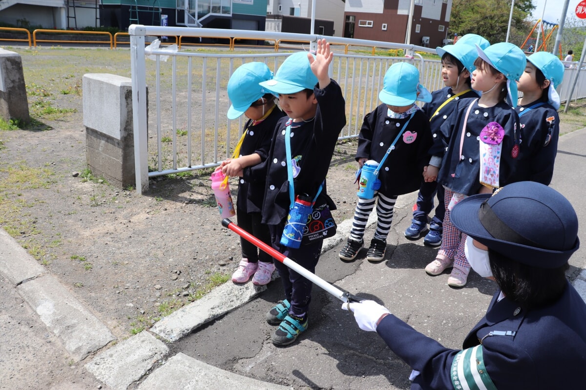 今日は、母と子の安全教育“こぐまクラブ”がありました。コロナ禍のため園児のみで道路の歩き方について、実際に道路を歩いて学びました。