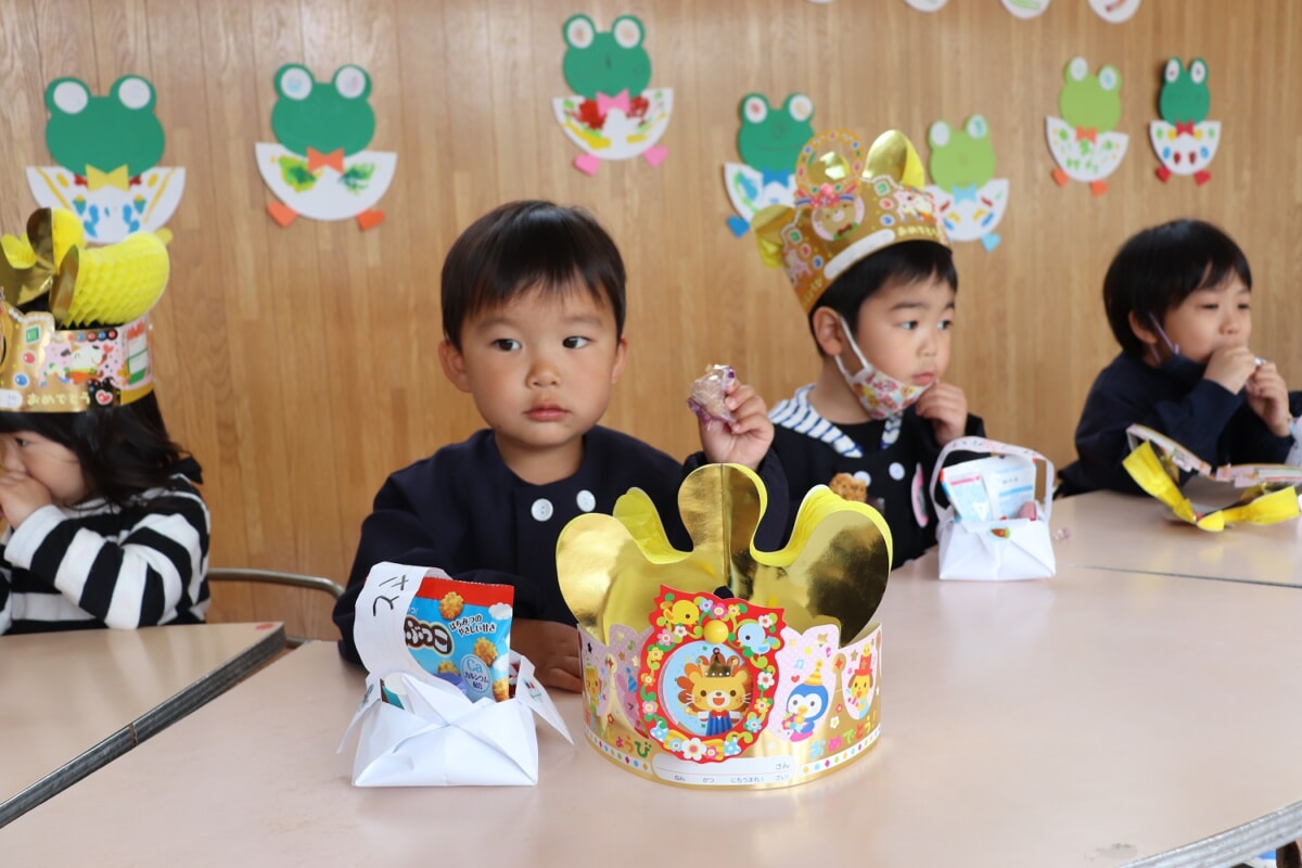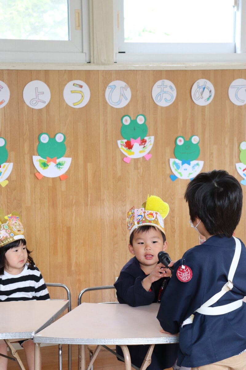 アクセス今日は、4月・5月・6月生まれのお友だちのお誕生会を行いました。今回は10名がお誕生児でした。会場飾りのカエルは、もも、ゆり組が作ってくれました。