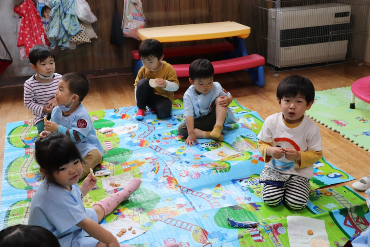 よし!今日はひまわり組の保育室でシートを敷いておやつタイム!みんなで食べるとおいしいね!