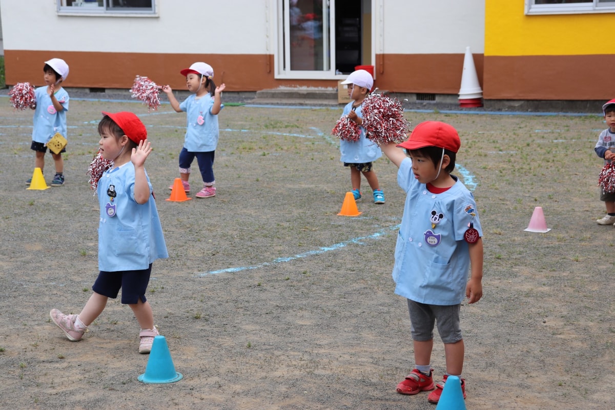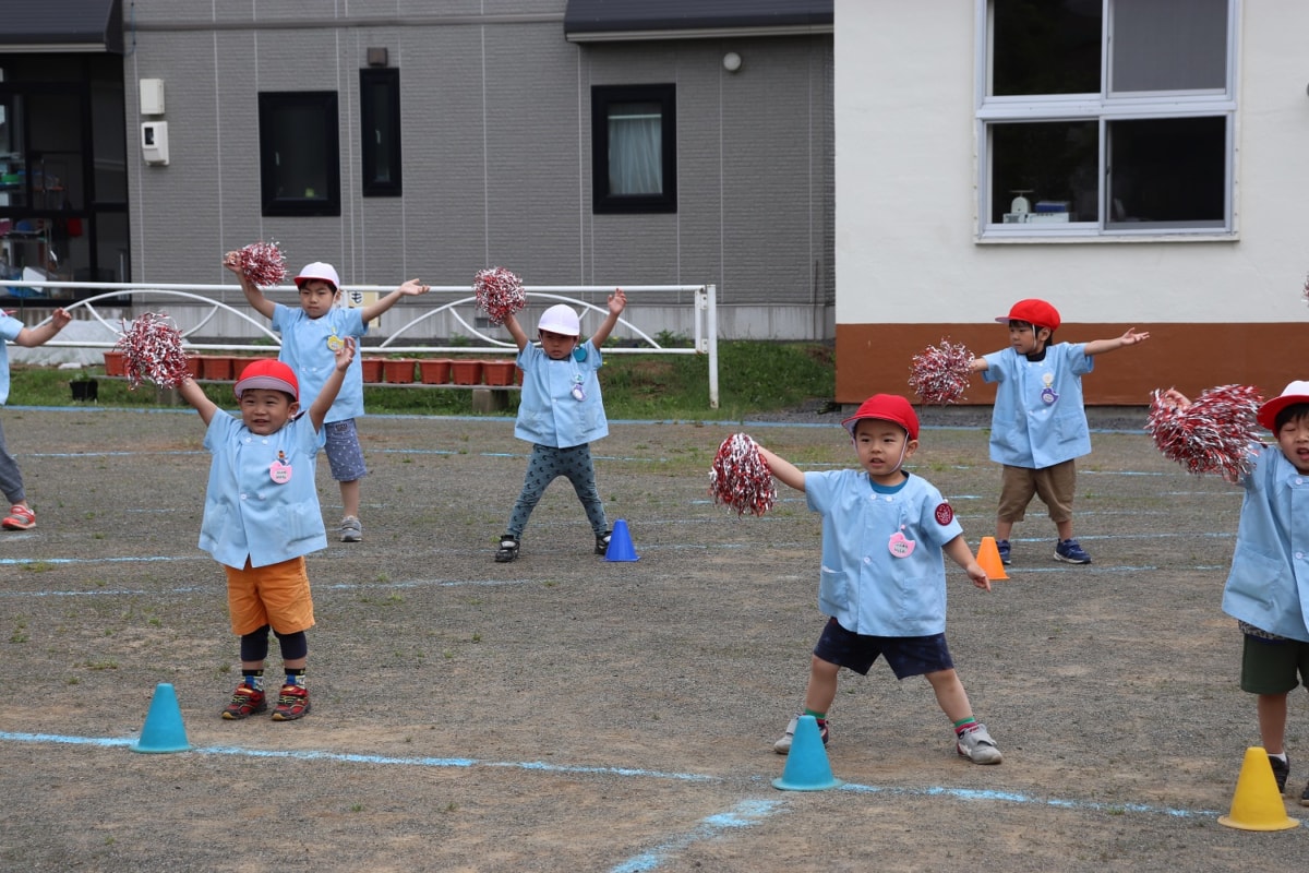ゆうぎもおうちの人に見てもらおうと、今日はポンポンを持って踊っています。手を高く上げてキラキラキラ☆ ゆうぎは「えがおのまほう」。みんなニコニコ顔です!