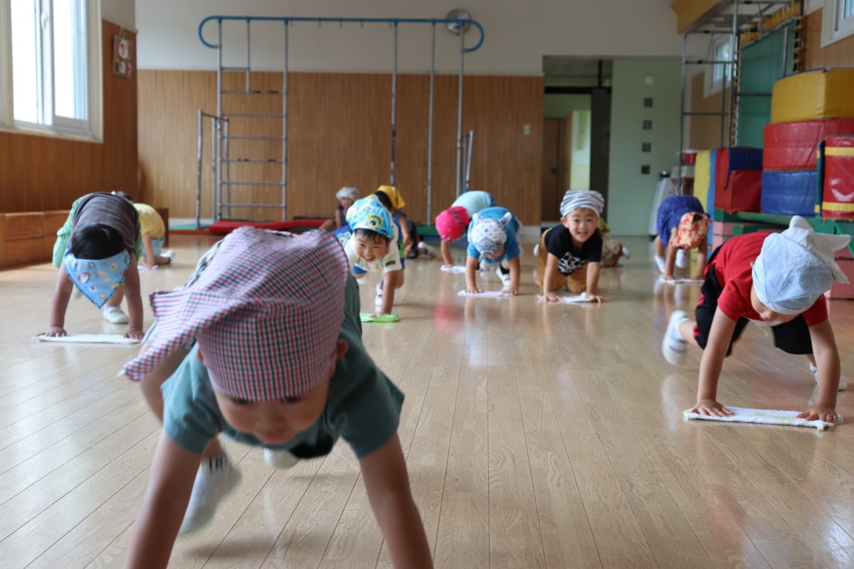 保育室がピカピカになったので、次はおあそび室もピカピカにしましょう。床の雑巾掛け、位置について、よーいドン!